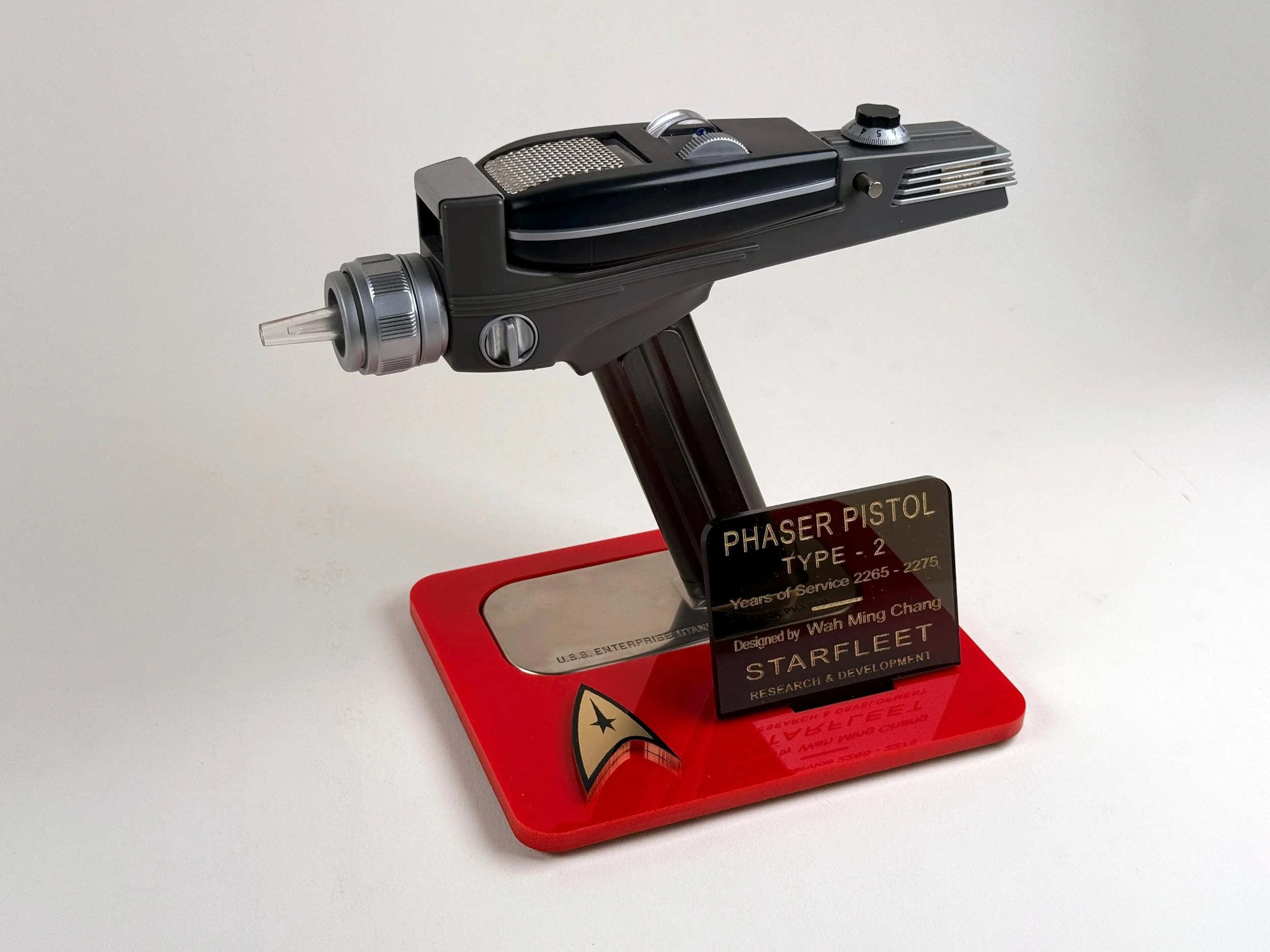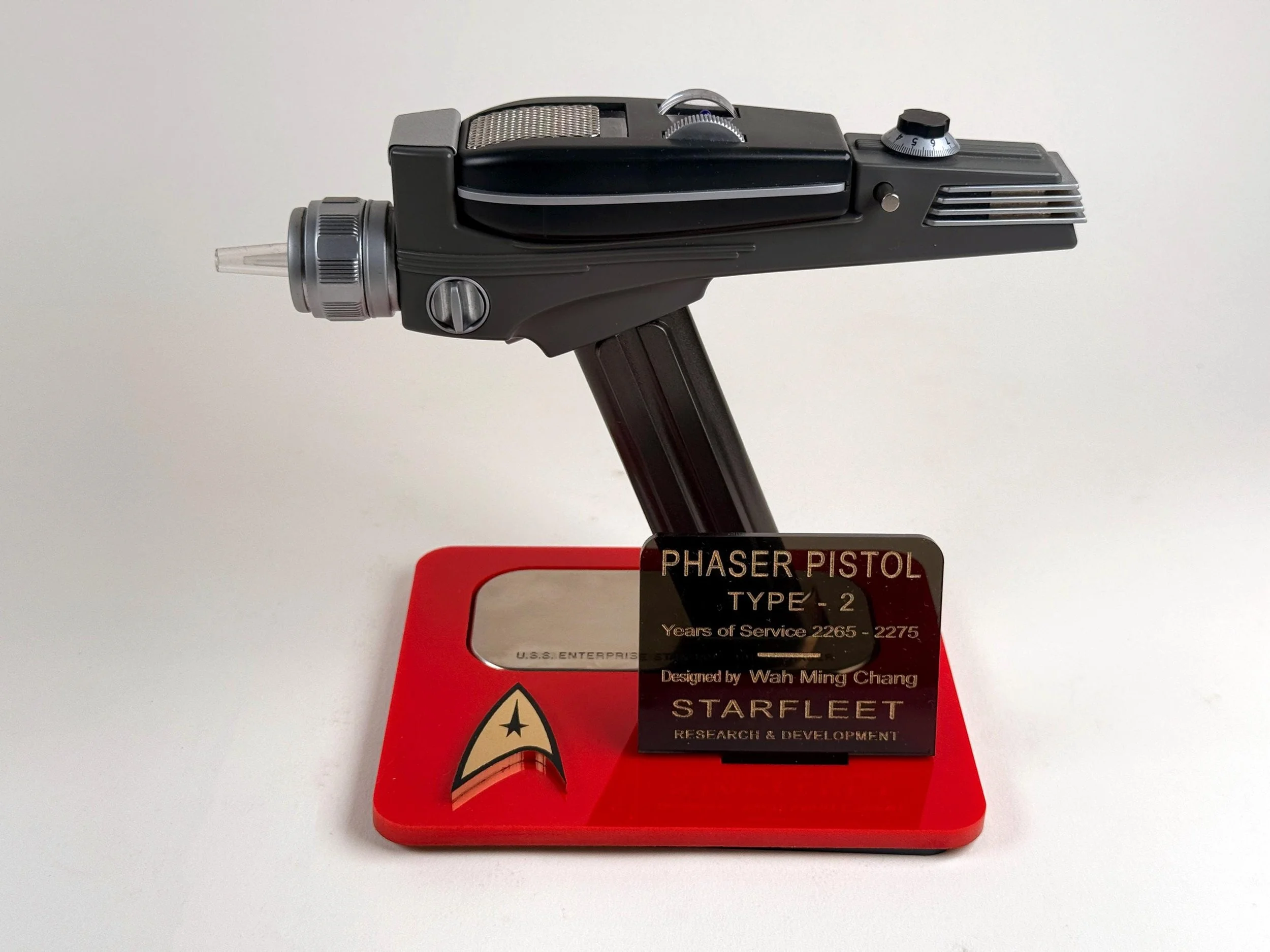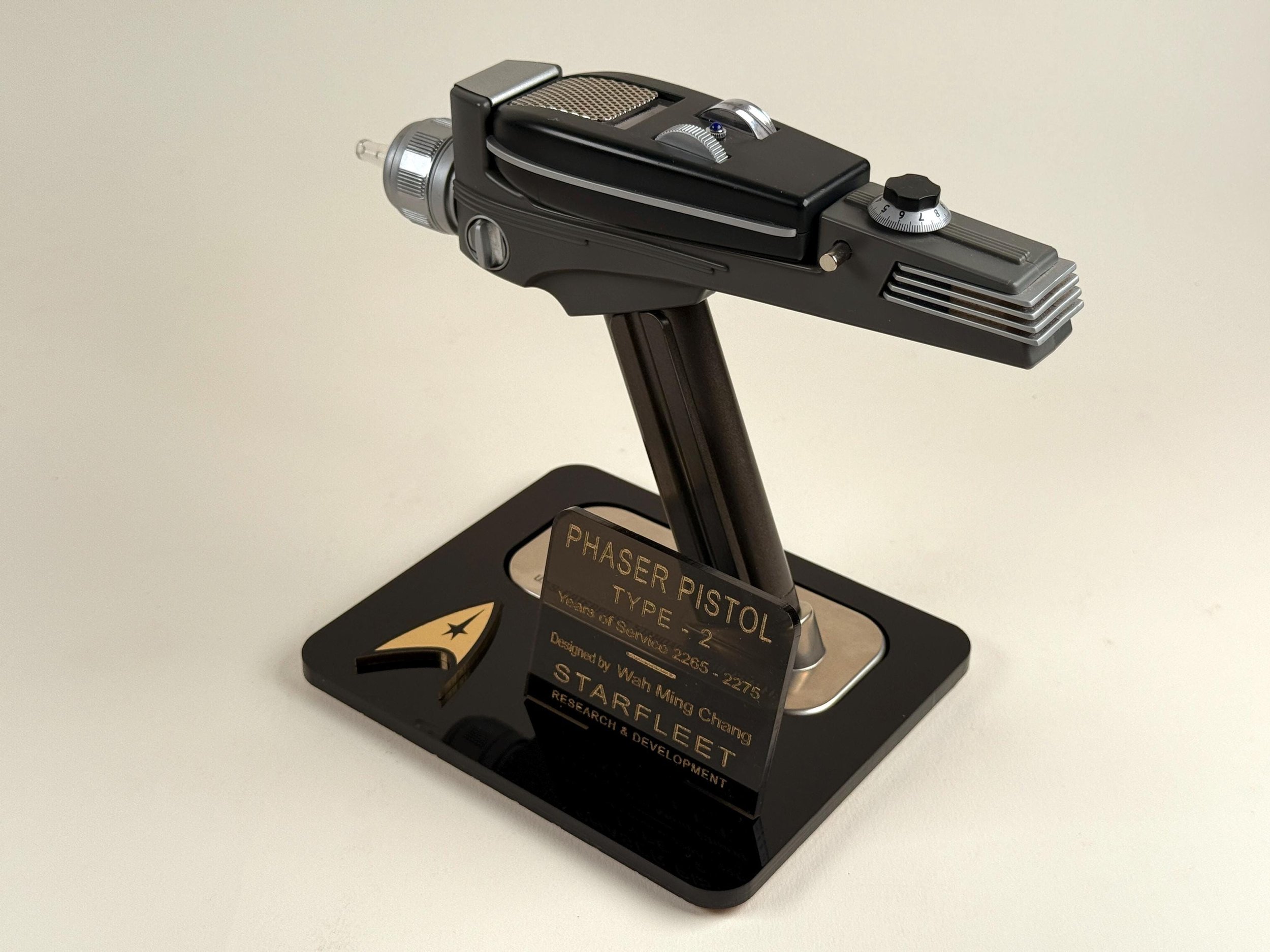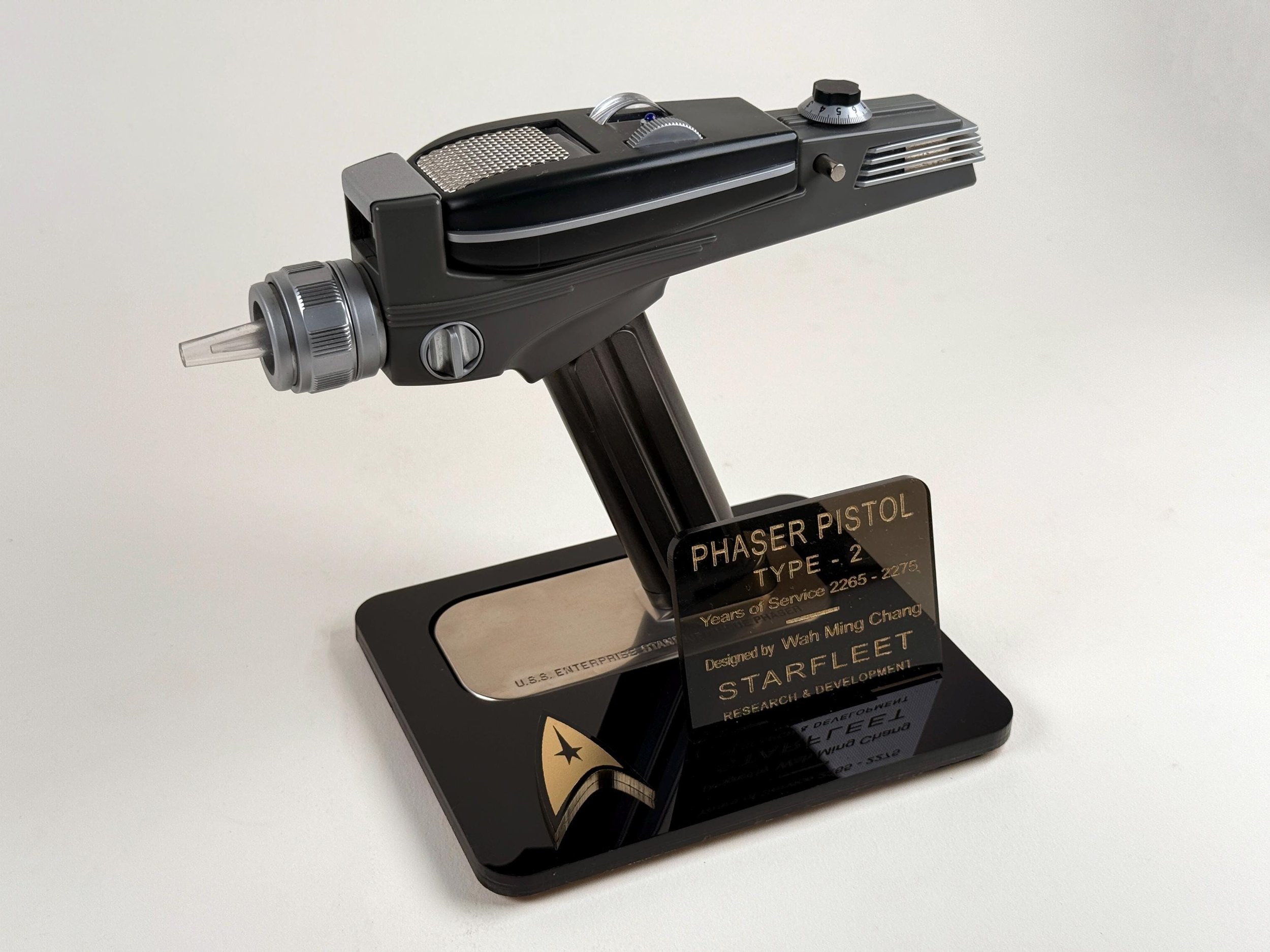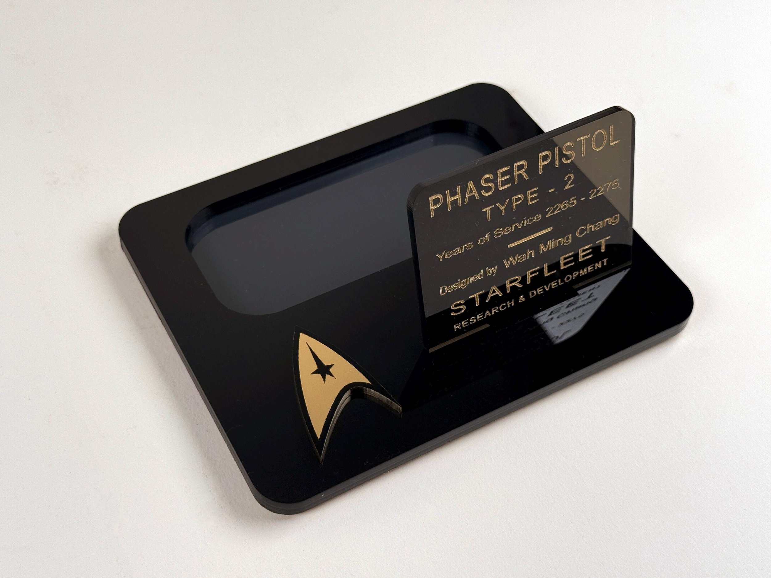 This display stand is designed specifically for the Wand Company's Replica Star Trek Original Series Type 2 Phaser. I offer two different kinds of display stands (see other listings on my shop page) in two colors, all with the classic series Star Trek aesthetic.