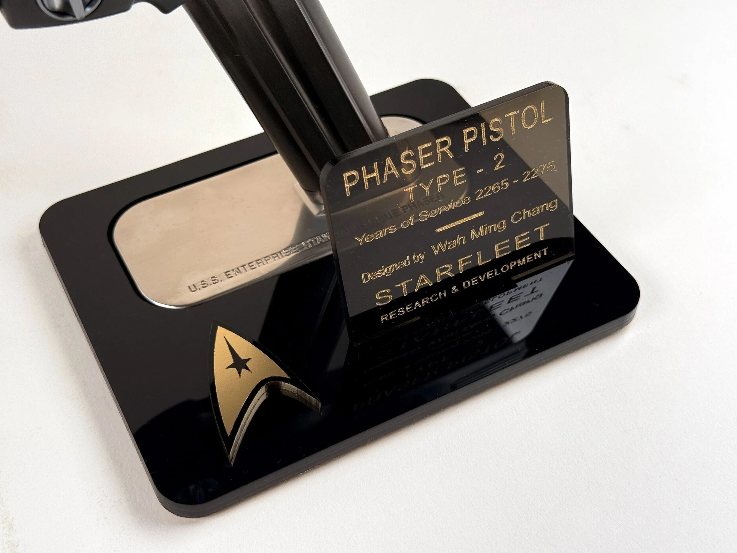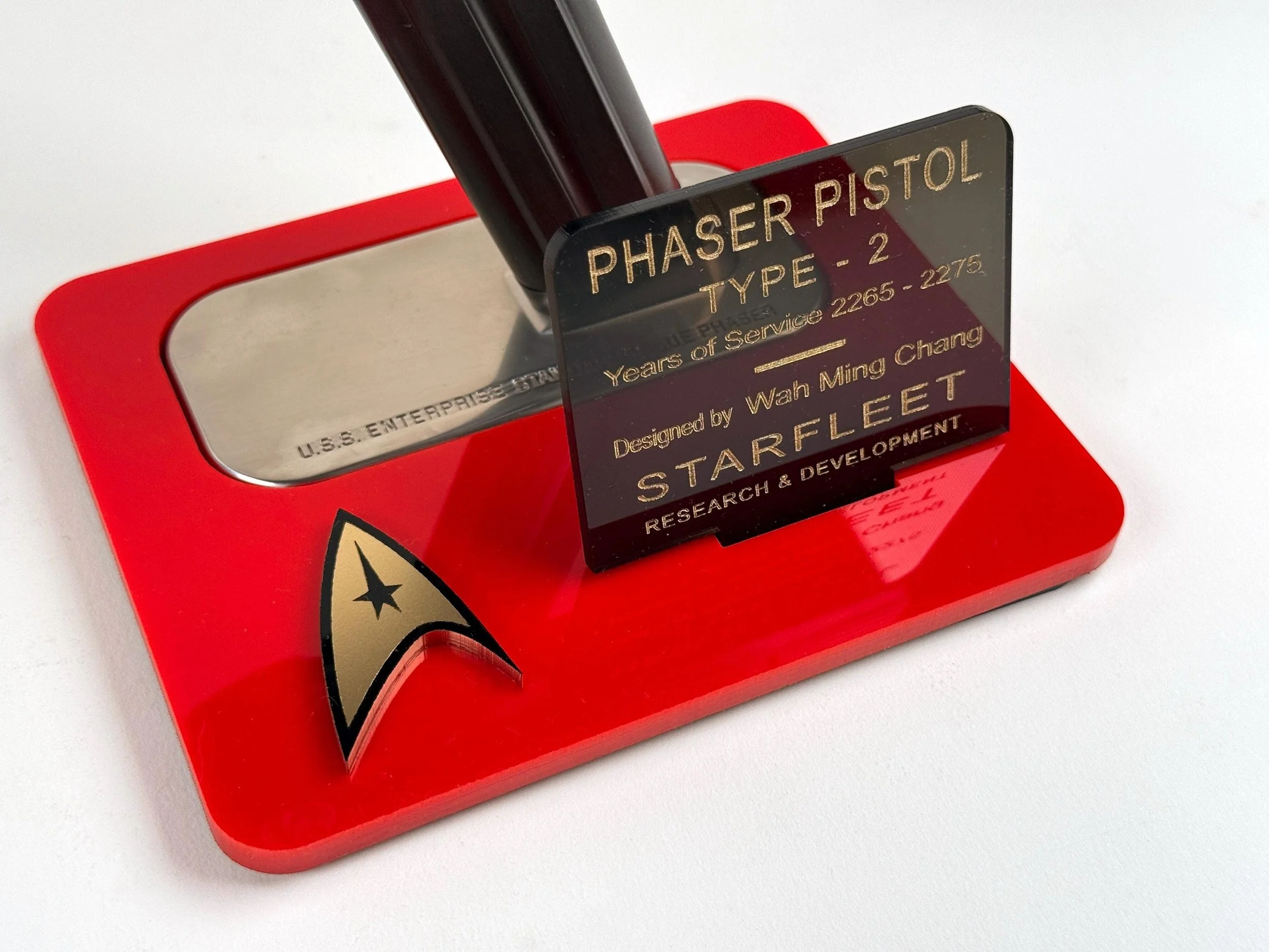 This display stand is designed to be used with the factory base that comes with the Wand Company Phaser. The factory base rests in a secure cradle on this display stand and holds the Phaser securely. The included plaque displays information that is canon to Star Trek the Original Series, such as the items description, years of service and designer recognition.