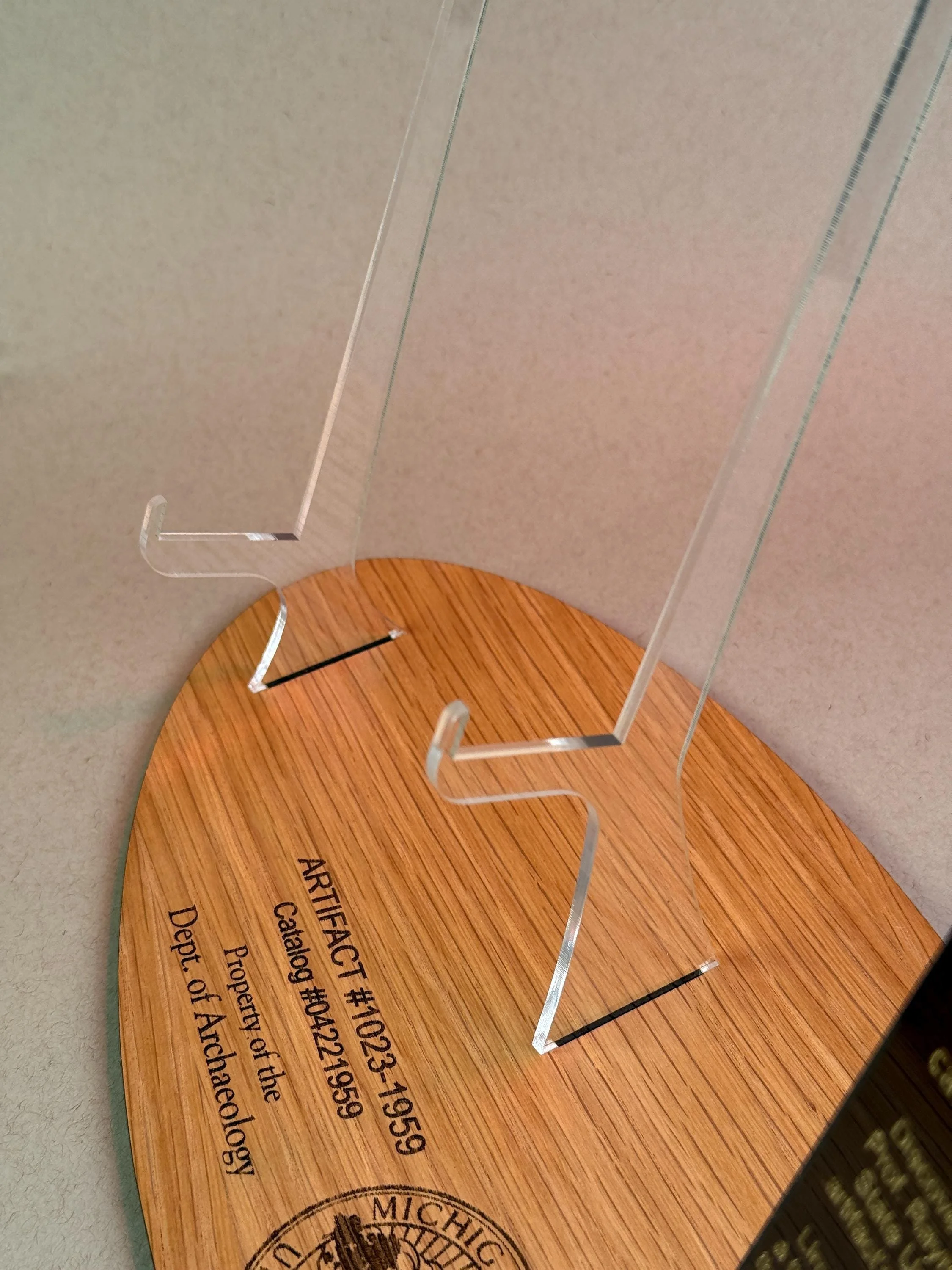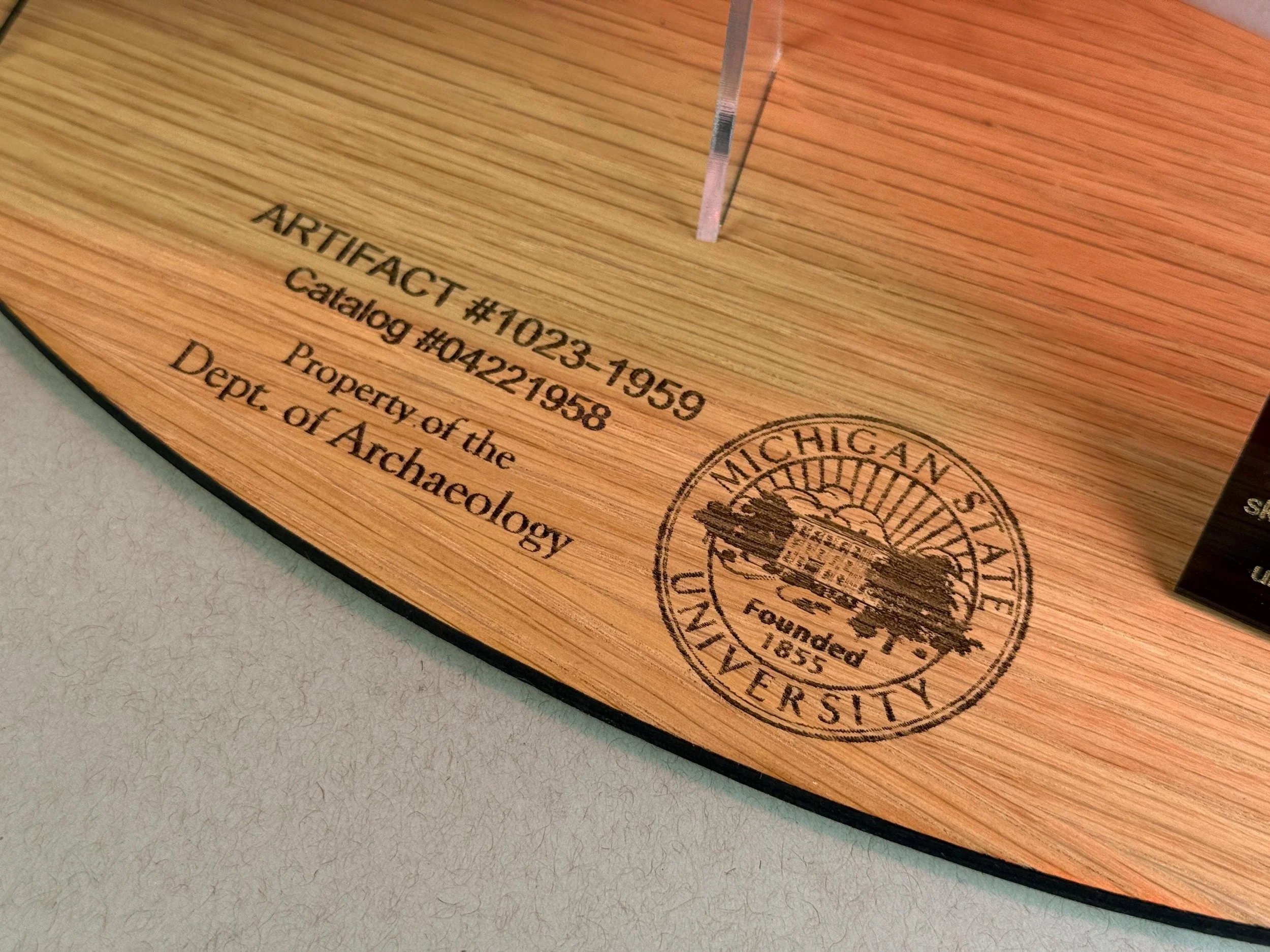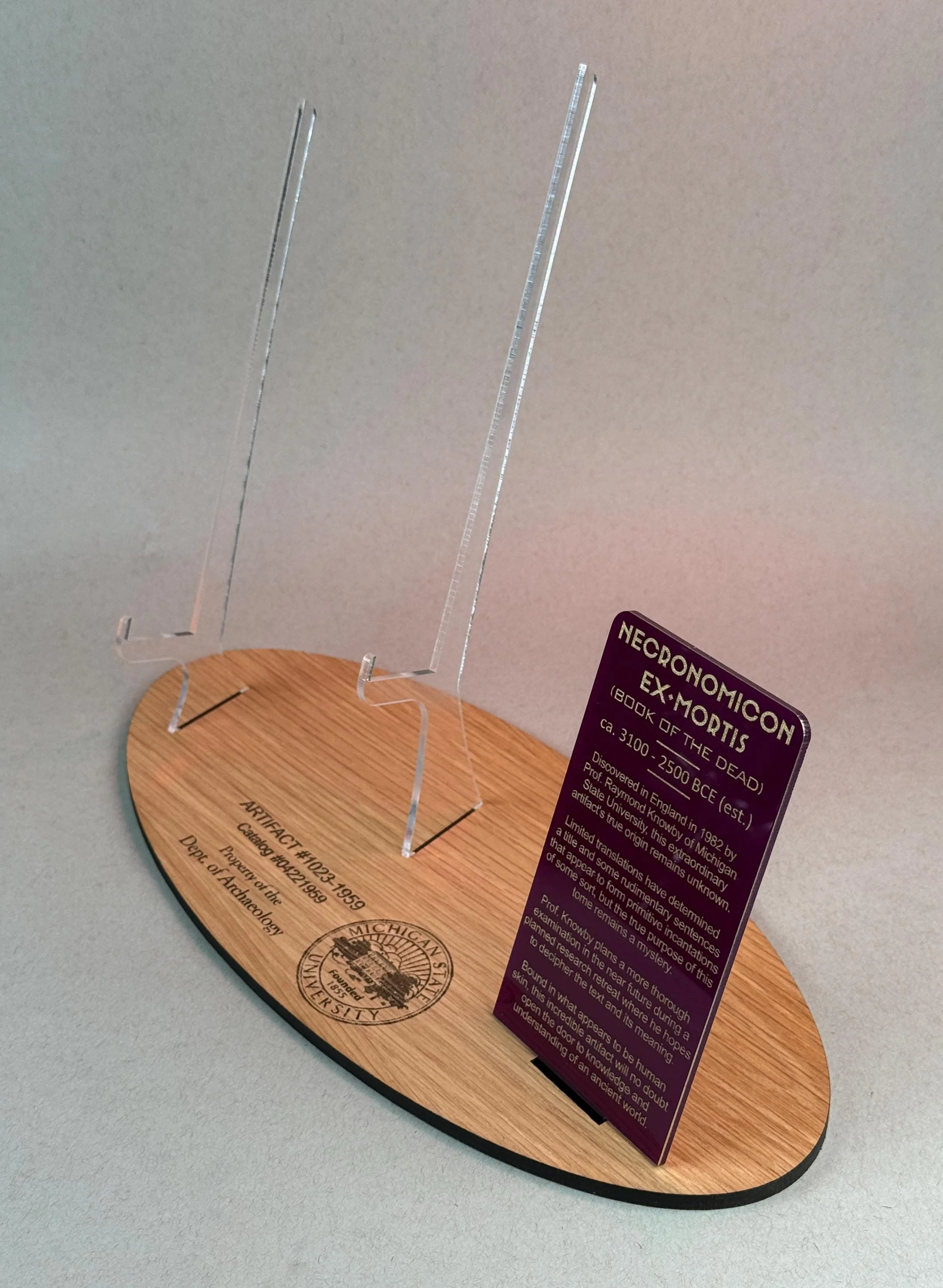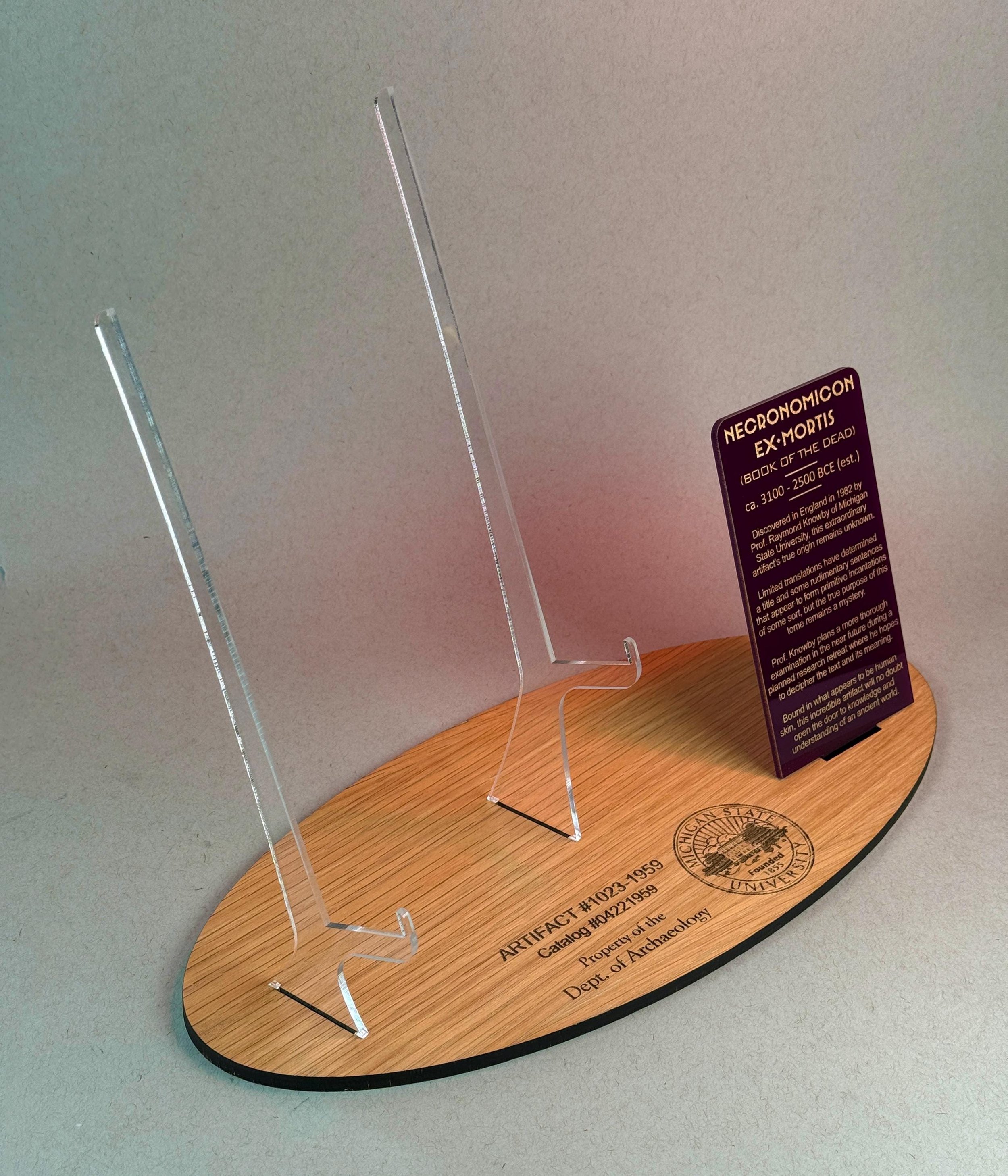 The oak veneer stand comes with beautifully made clear acrylic supports that loft the book above the display base and hold it as a pleasing and very flattering angle, almost as if it is levitating. The base comes engraved with the MSU logo and the artifact and catalog number clearly engraved. A little easter egg for those sharp eyed fans.