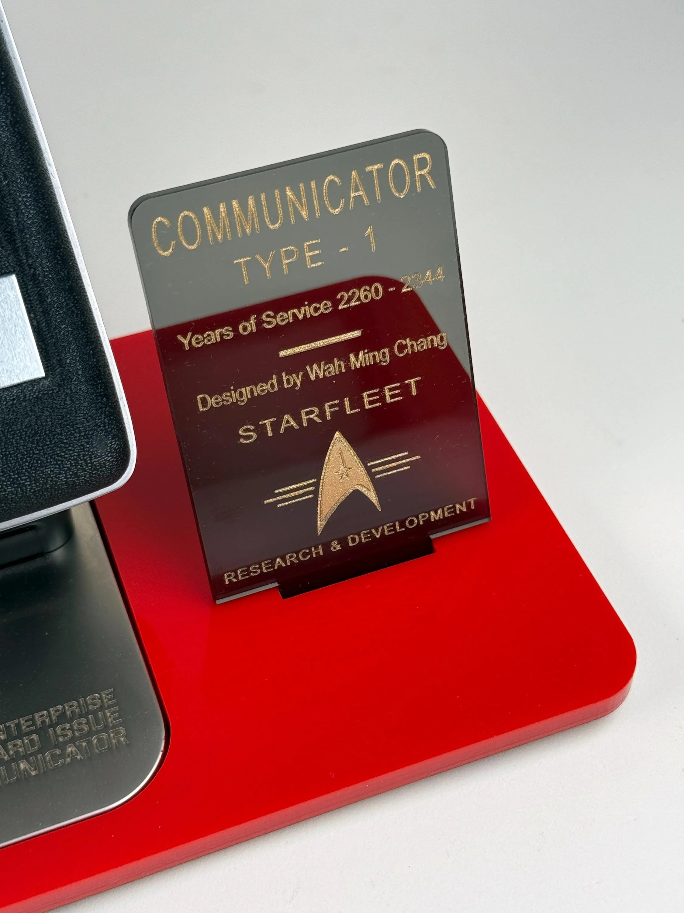 This display stand is designed to be used with the factory base that comes with the Wand Company Communicator. The factory base rests in a secure cradle on this display stand and holds the Communicator securely. The included plaque displays information that is canon to Star Trek the Original Series, such as the items description, years of service and designer recognition.