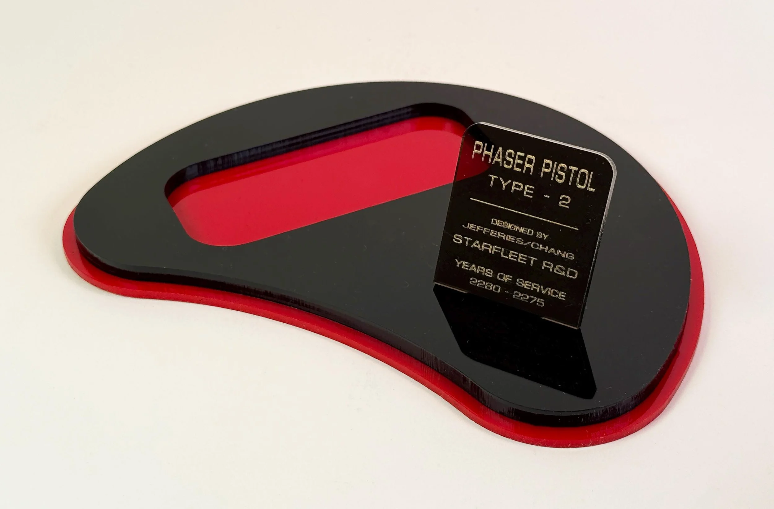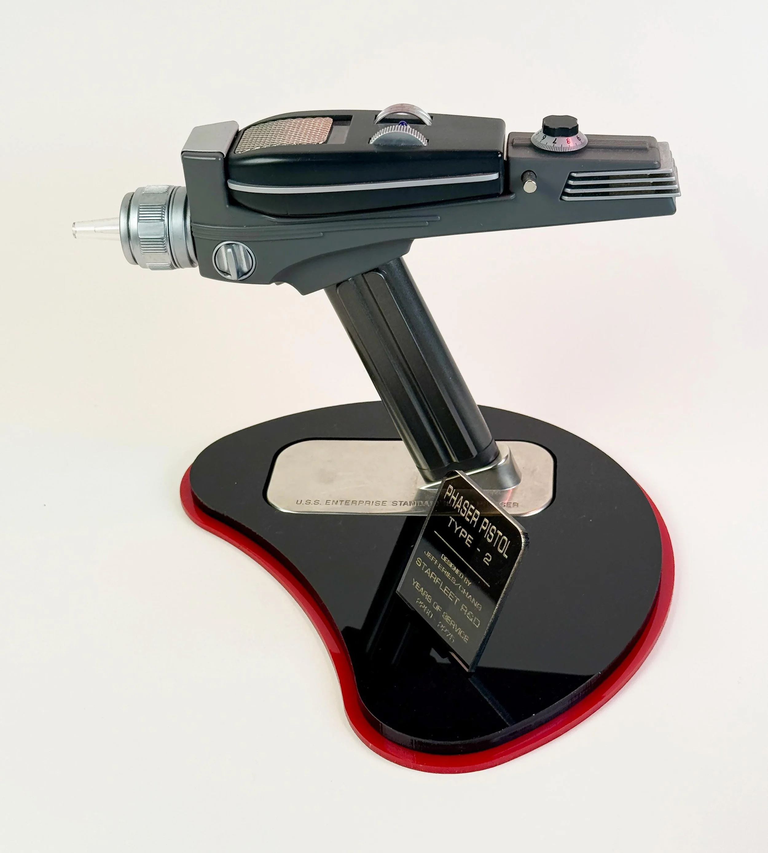 This display stand is designed to be used with the factory bases that comes with the Wand Company Props. The factory base rests in a secure cradle on this display stand and holds the three props securely. The tricorder display stand also features an acrylic backboard that is designed to hold the Tricorder's strap securely in place. The included plaques displays information that is canon to Star Trek the Original Series, such as each items model, years of service and designer recognition. All of the plaques are written in an "in universe" style, meaning that they do not break the illusion of these props being genuine artifacts from that universe. No cheesy "Star Trek" logos or anything like that. Just dignified, genuine looking, exhibit quality museum style signage.