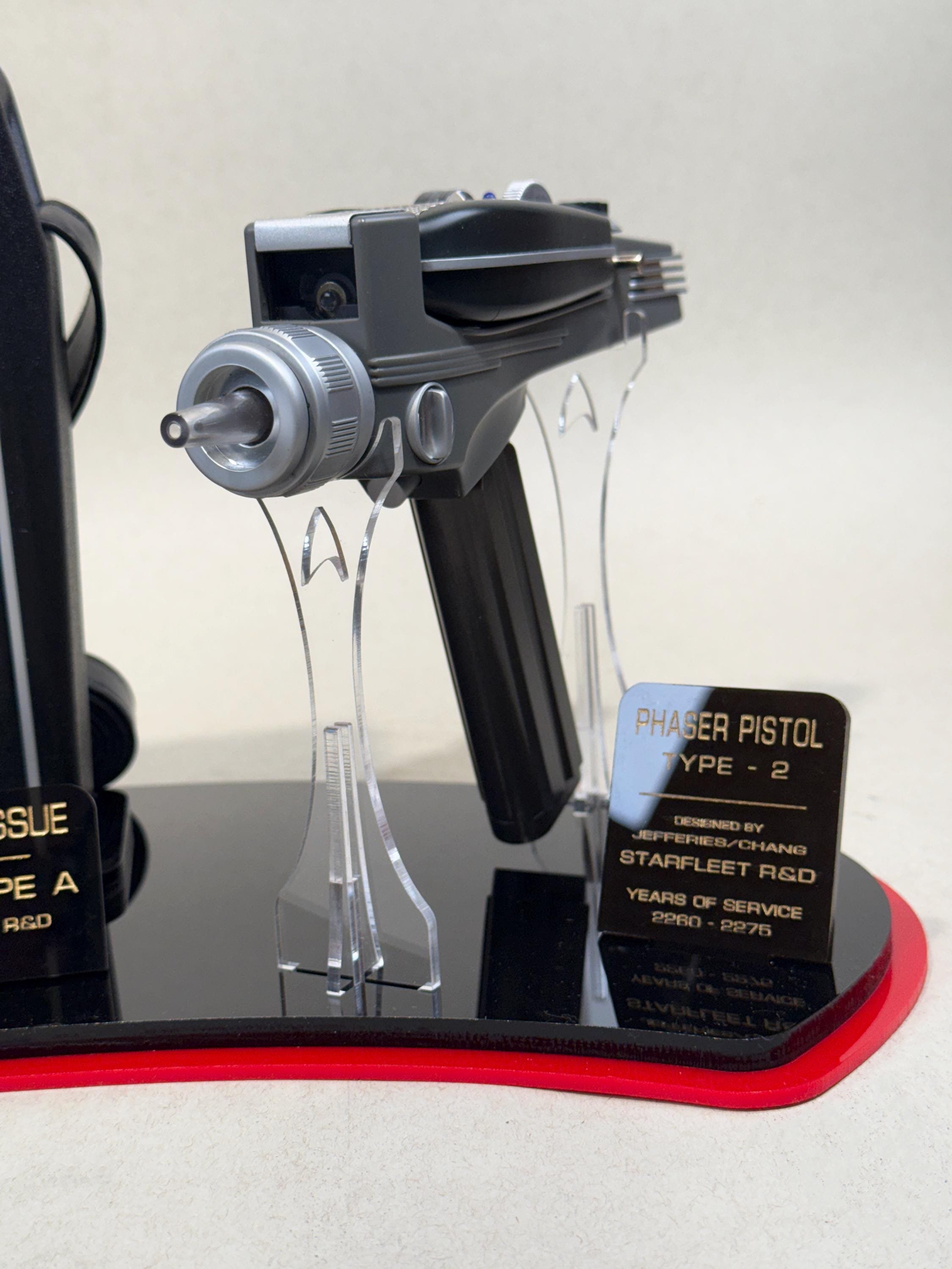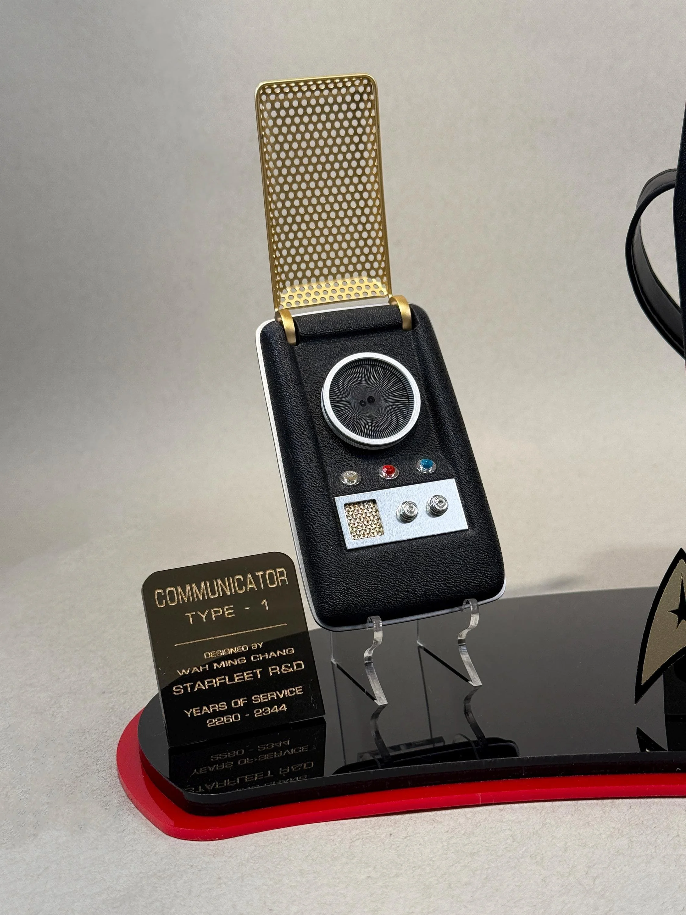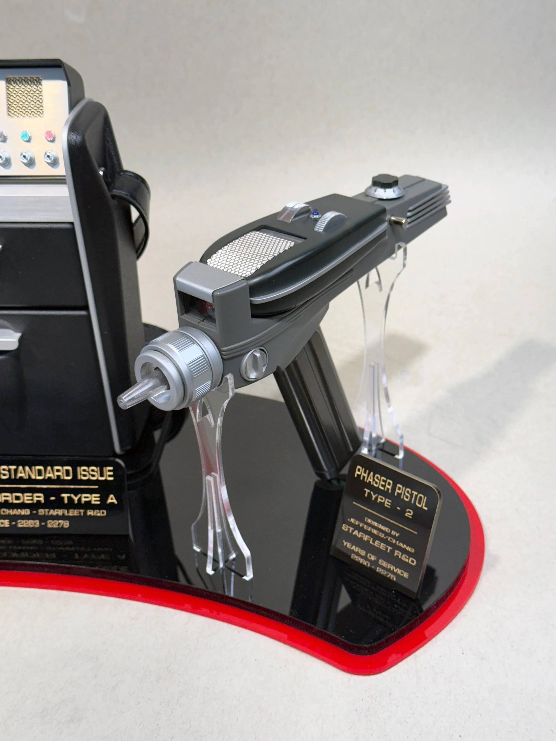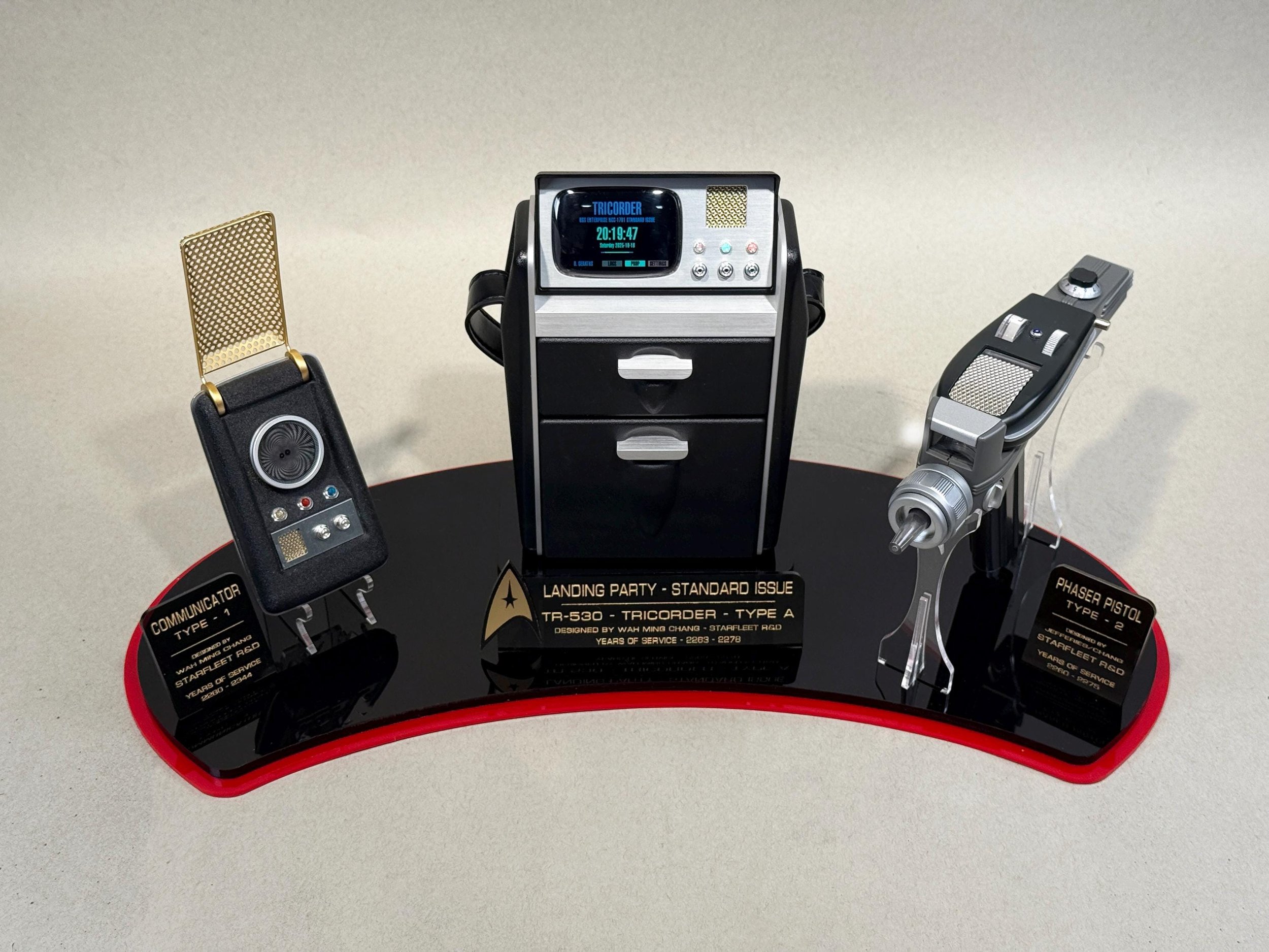 This amazing stand is designed to mimic in color and style the aesthetic and art design of the original Star Trek series. The base comes with stands for both the Communicator and Phaser, each made of crystal clear acrylic so as not to detract from the beauty of the mounted props. It also features plaques that display information that is canon to Star Trek the Original Series, such as each items model, years of service and designer recognition.