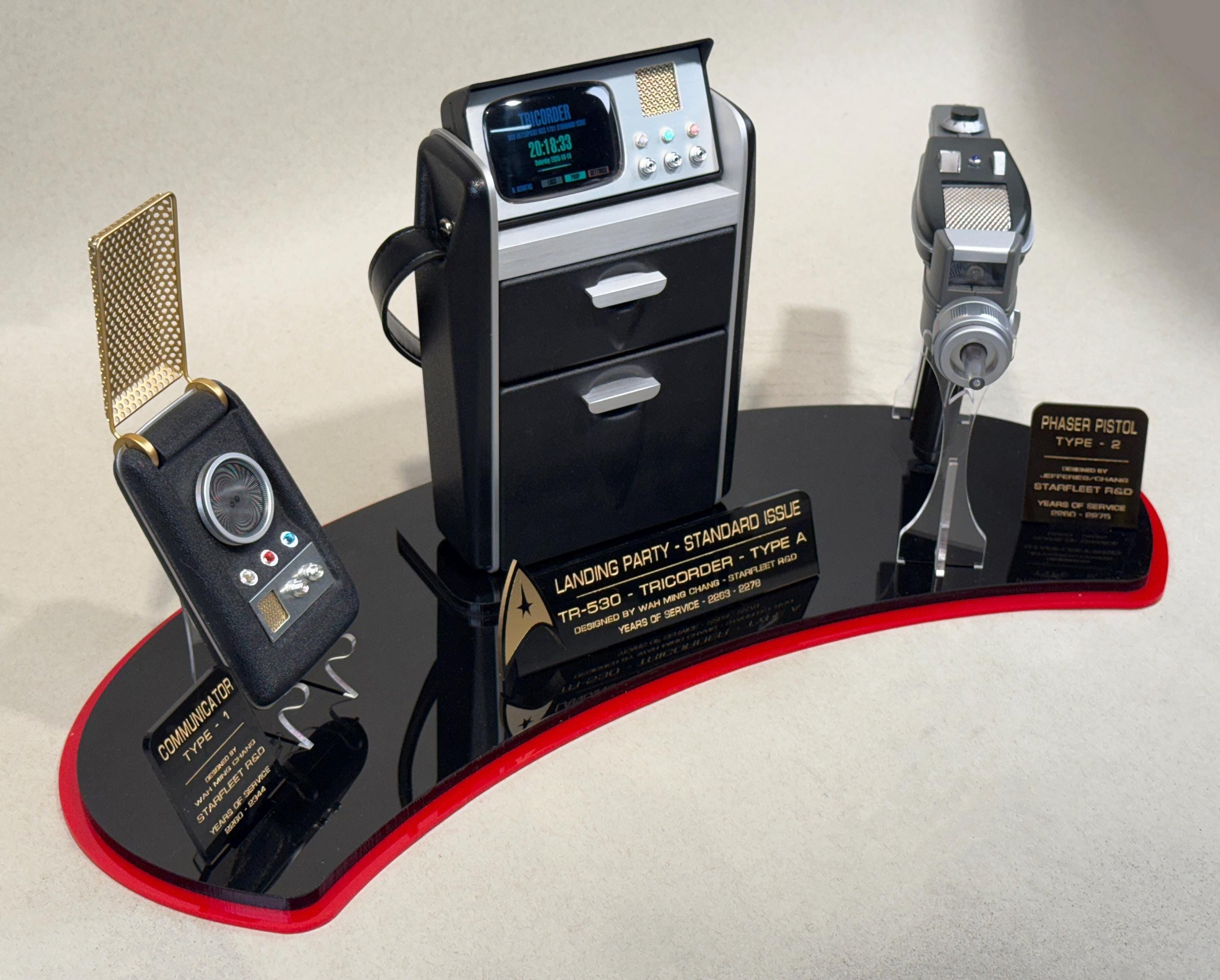 This display stand DOES NOT include the Tricorder, Communicator or Phaser replicas. The props shown in the photos is for demonstration purposes and illustrates how yours will look when displayed on this wonderful display stand.